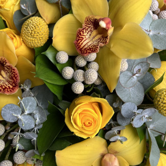 «Симфония» выполнена в желто-зеленом оформлении. Букет имеет два подвида: стандарт (орхидей, 7 роз, 7 краспедий, эвалипт, салал, бруния) и делюкс (6 орхидей, 9 роз, 9 краспедий, эвкалипт, салал и 6 бруний). Такие цветы идеально подходят для любителей теплых осенних тонов. Желтая декоративная лента не только свяжет весь букет, но и подчеркнет его цветовую гамму. Кроме того, если этого оказалась недостаточно, можно подобрать подходящее оформление. К примеру, фетр придаст подарку больше солидности.